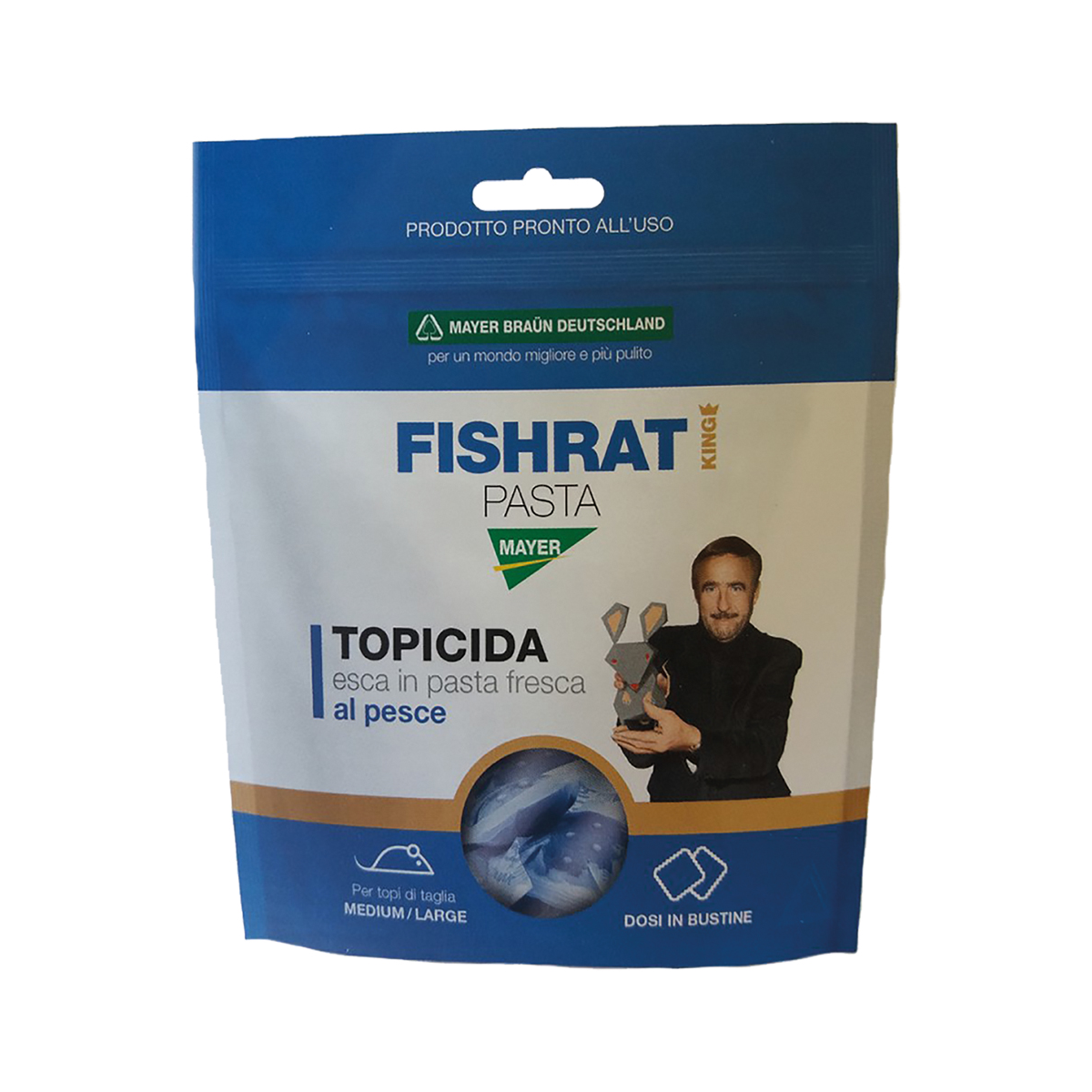L'esca per topi Mayer Braun Fishrat King da 150 g è un'esca in pasta fresca pronta all'uso a base di Brodifacoum, efficace per il controllo di topi e ratti di ogni specie e molto appetibile.