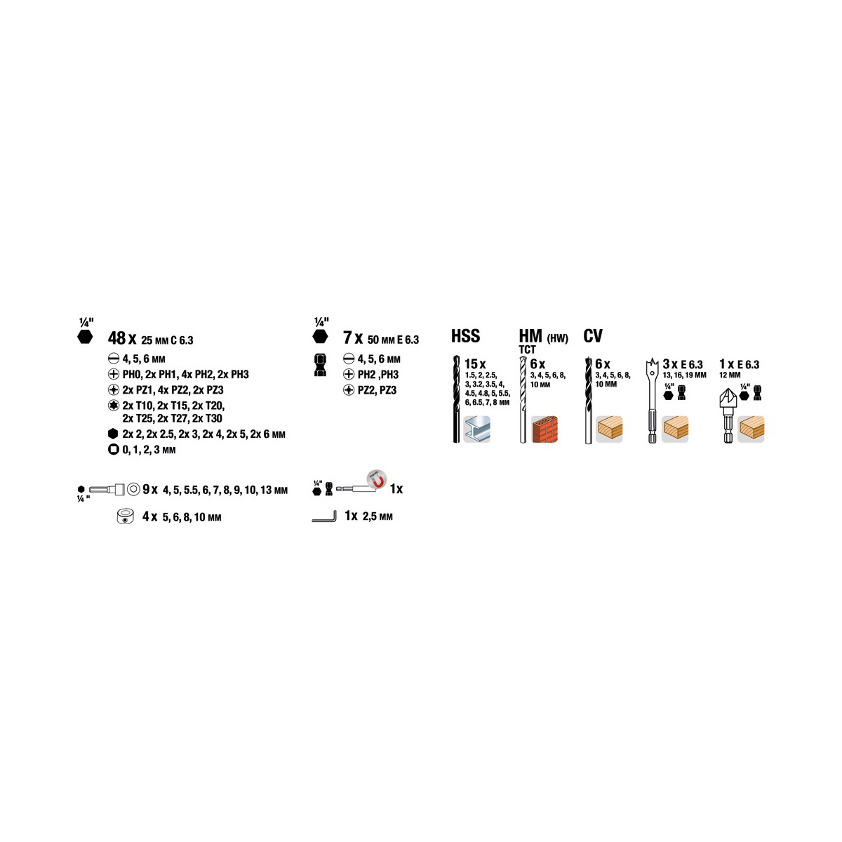- Ampio assortimento di bits PH, PZ, Torx e piatte