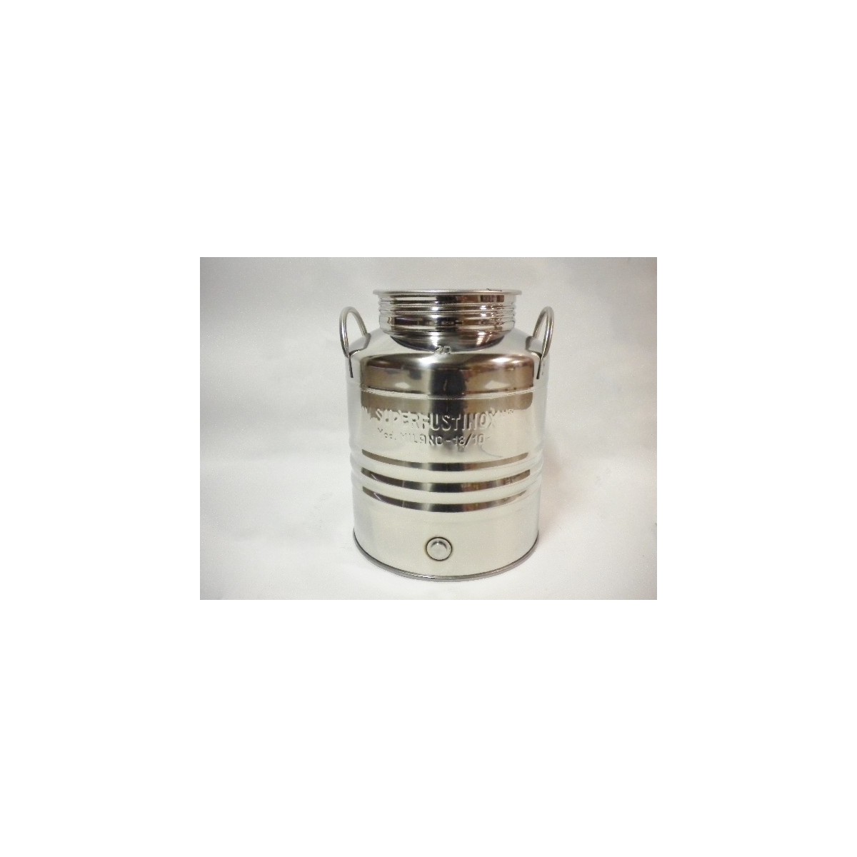 Fusto in acciaio inox da 20 litri con maniglie laterali, tappo di chiusura superiore a vite e predisposizione per rubinetto salvagoccia.