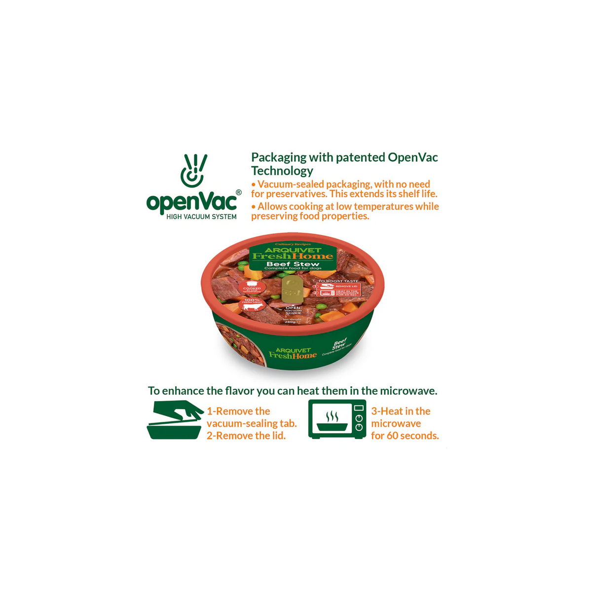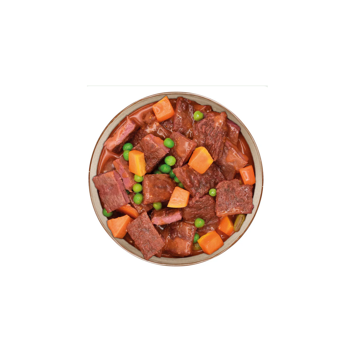 Stufato di manzo. Alimento completo umido per cani. Ricetta casalinga, cotta a fuoco lento come a casa, 100% naturale ed equilibrata. Ideale per cani di tutte le età, compresi quelli con stomaco sensibile o allergie alimentari. Può essere servito come pasto unico o utilizzato come delizioso "topping" per aggiungere sapore e aroma al cibo secco.