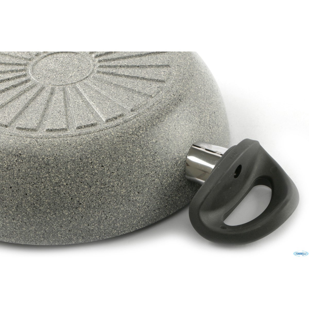 La superficie di cottura di questo tegame anriaderente, è realizzato con piccole particelle di pietra unite che la convertono nel tegame più resistente sul mercato.