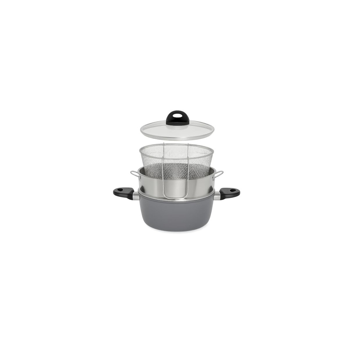 - MULTIFUNZIONE: Casseruola 4 in 1 con cestello per cottura a vapore, cestello per frittura e coperchio in vetro incluso, diametro 22 cm