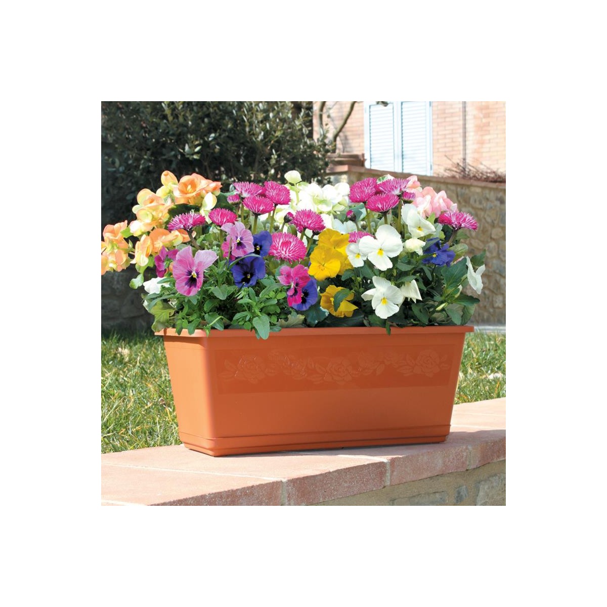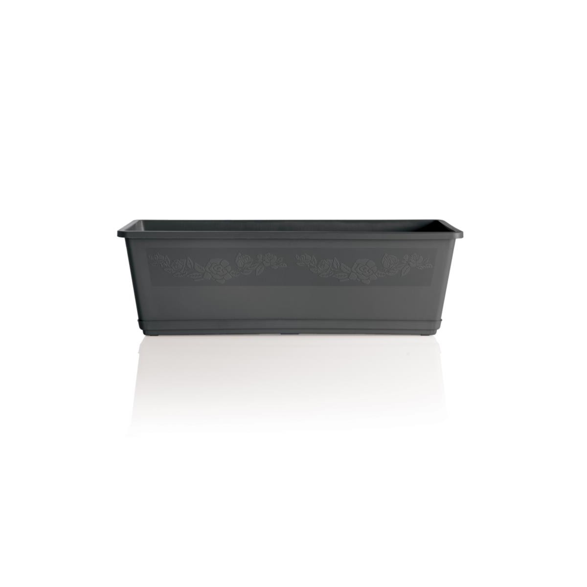 Elegante fioriera provvista di sottovaso, caratterizzata da una graziosa banda floreale in rilievo che percorre tutta la superficie esterna.