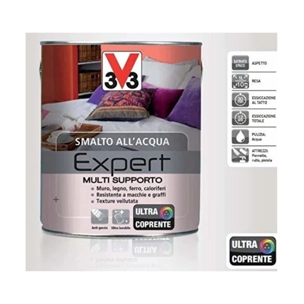 SMALTO ACQUA V33 EXPERT MULTISUPPORTO SMALTO MONOMANO ULTRA COPRENTE: 98% di opacita' che garantisce un alto potere coprente LA TEXTURE VELLUTATA permette di stendere piu' pittura al primo passaggio di rullo in maniera piu' omogenea. Muro, ferro, legno, caloriferi. Resistente a macchie e graff. Texture vellutata. Utilizzabile anche all?esterno con fondi specifci. Inodore e rapida asciugatura Aspetto sanitato opaco Resa 1l / mq 10 Essiccazione al tatto 30 min Essiccazione totale 12 ore Pulizia attrezzi acqua Posa a pennello, rullo, pistola