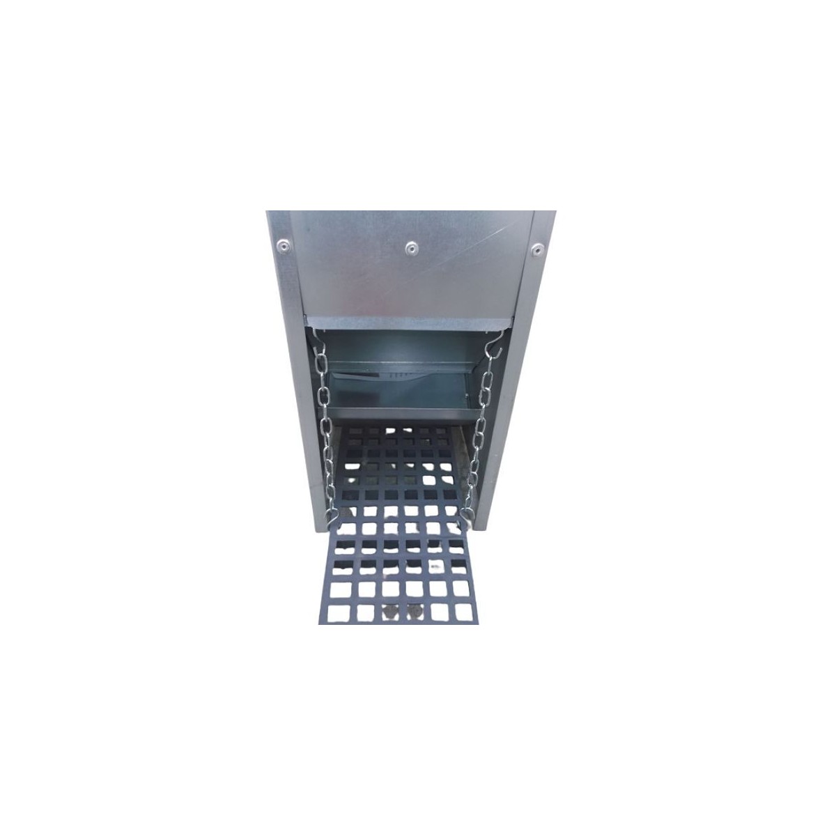 Quando un animale di peso sufficiente sale sulla pedana lo sportello di chiusura si apre per permettere l'accesso al mangime e alle granaglie, quando l'animale scende dalla pedana lo sportello si richiude. Mangiatoia adatta per polli, anatre, faraone, ecc.